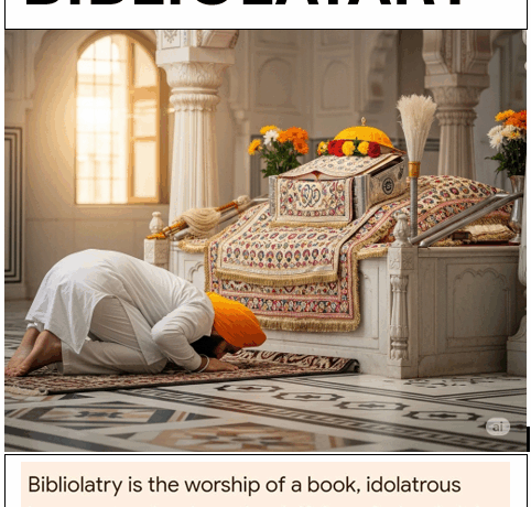 For the Sikh, the Guru Granth Sahib (GGS) is the one enduring guru. There is no other religion that even comes close to worshipping a book as does Sikhism. The Muslims respect the Koran and Christians respect the Bible but they do not bow down to their scriptures. Islam where there is great reverence for the Koran and a prevailing view that the Koran is eternal in heaven, comes close but Sikhism surpasses even that. It has been said that Sikhs bow down to the GGS to show respect for what is written in the book. But one can have respect for the law and of law books and what is written in them, but you do not go to the law library, take your shoes off, cover your head and bow down to them. One can have respect for the President of the United States, the Queen of England, or the Prime Minister of India, but you do not get on your knees and bow down to them in obeisance. Showing respect is one thing but as in the case of the GGS, BOWING DOWN as an act of reverence or obeisance is by definition WORSHIP and hence implicit idolatry/bibliolatary. There is no question about this although it is actively suppressed and denied. Even a Hindu will typically say that he does not worship the object but the spiritual reality that it represents.